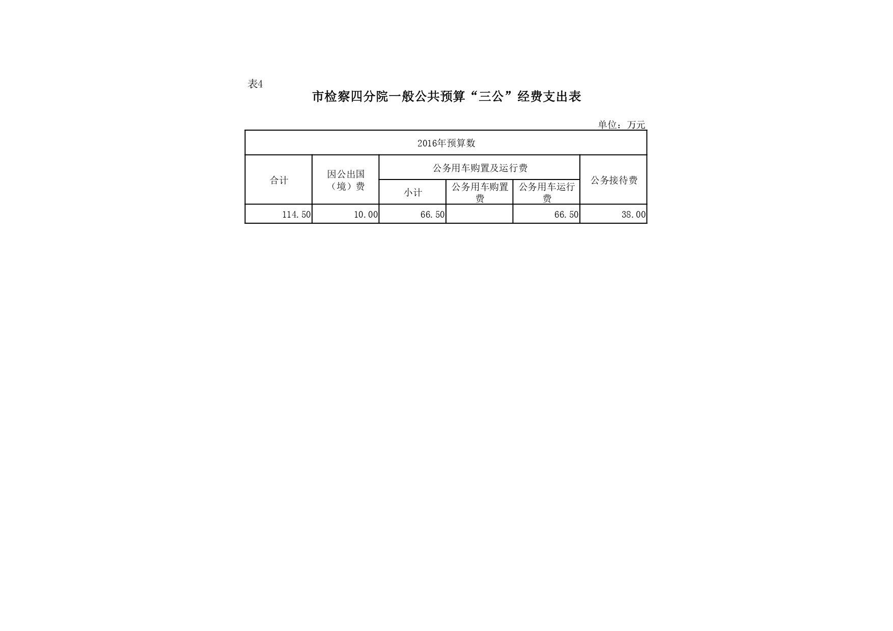 2016年“三公”经费预算114.5万元(因公出国(境)10万元,公务接待38万元,公务用车运行维护费66.5万元),与2015年“三公”经费预算136.78万元相比减少了32.28万元,主要是公务车改革后公务用车运行费相应减少原因。