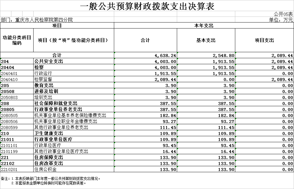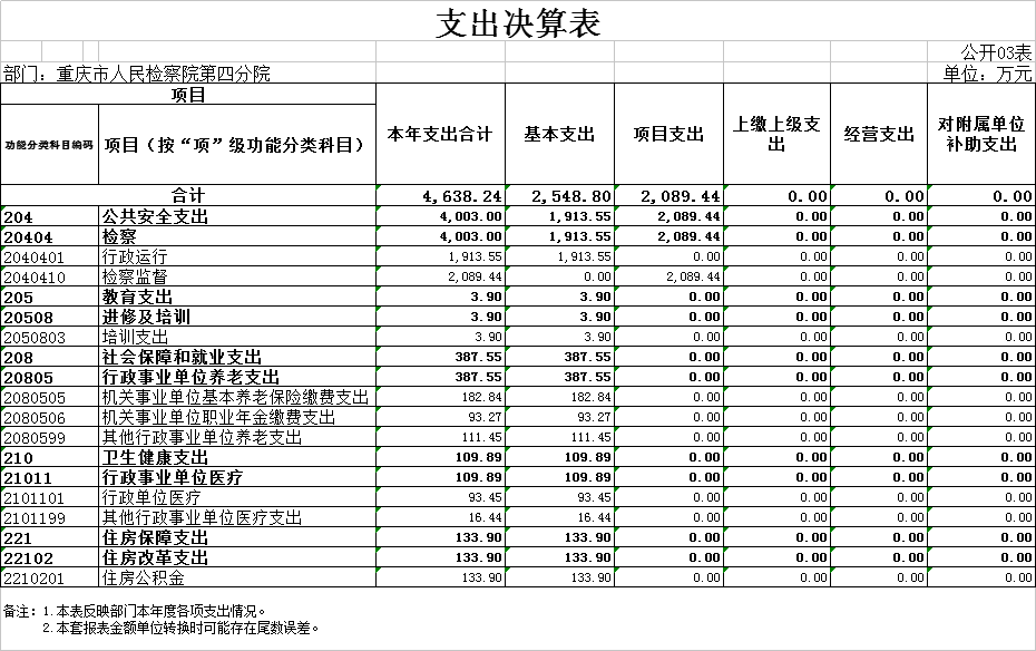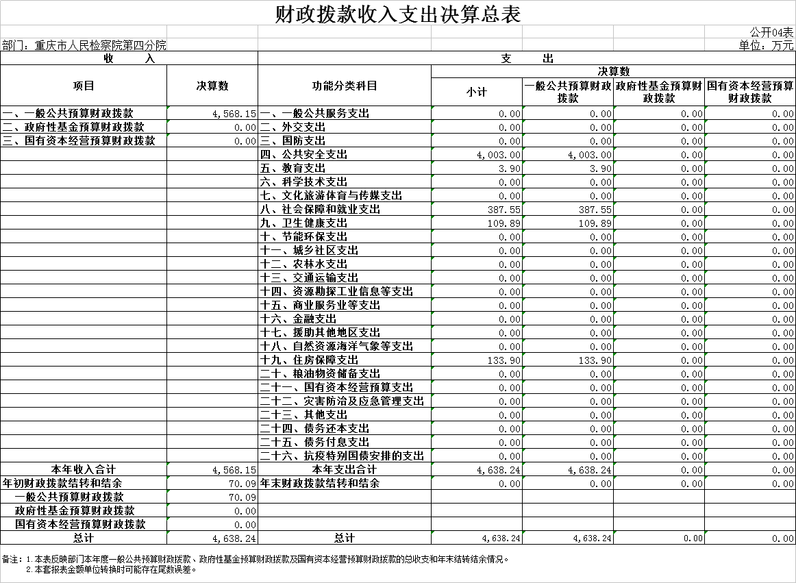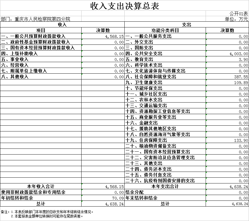 2024年度收、支总计均为4638.24万元。收、支与2023年度相比,增加1581.32万元,增长51.73%,主要原因:一是本年度追加了职业年金政策性补缴、一次性健康休养费、退休“中人”一次性补贴、员额制绩效考核奖金、人员政策性清算等资金;二是2024年度新增了技侦大楼及附属工程经费及办案中心装修改造等一次性项目经费。