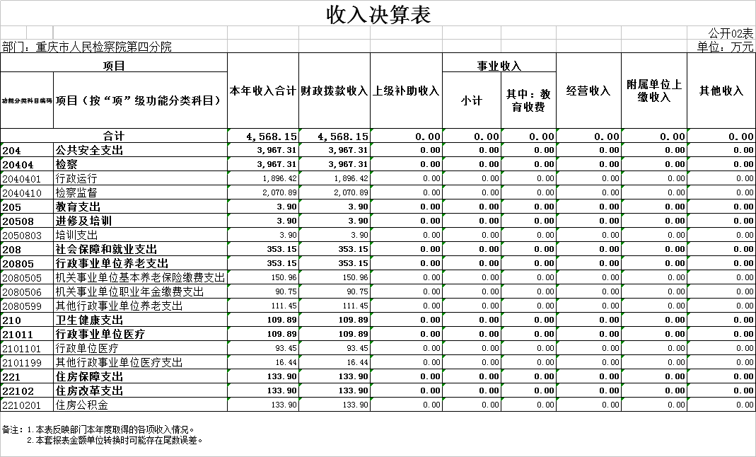 1.收入情况。2024年度收入合计4568.15万元,与2023年度相比,增加1554.26万元,增长51.57%,主要原因:一是本年度追加了职业年金政策性补缴、一次性健康休养费、退休“中人”一次性补贴、员额制绩效考核奖金、人员政策性清算等资金;二是2024年度新增了技侦大楼及附属工程经费及办案中心装修改造等一次性项目收入。其中:财政拨款收入4568.15万元,占100%;事业收入0万元,占0%;经营收入0万元,占0%;其他收入0万元,占0%。此外,使用非财政拨款结余和专用结余0万元,年初结转和结余70.09万元。