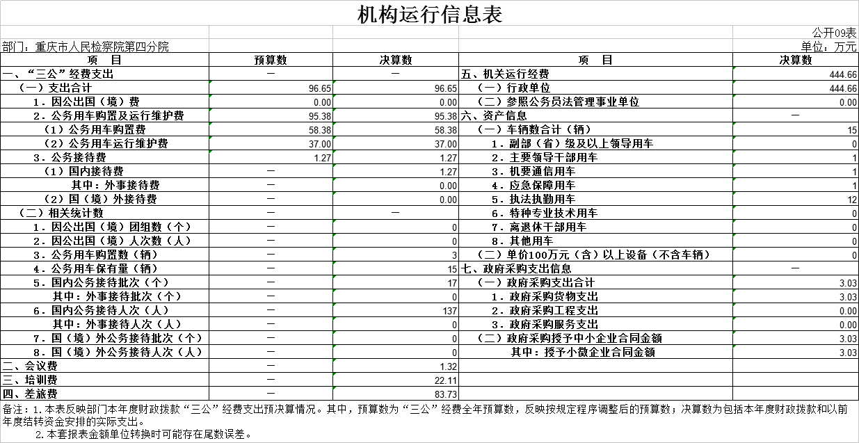 2024年度本部门机关运行经费支出444.66万元,机关运行经费主要用于开支办公费、差旅费、培训费、公务车运行维护费、维修费等。机关运行经费较上年支出数减少6.79万元,下降1.5%,主要原因是我院厉行节约,严控机关运行成本。