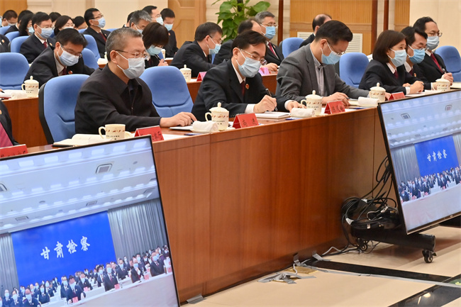 最高检党组副书记、常务副检察长童建明主持会议。会议以视频方式开至各省级检察院。中央纪委国家监委、中央政法委有关负责同志到会指导。最高检领导、检委会专职委员,中央纪委国家监委驻最高检纪检监察组,最高检机关各内设机构、直属事业单位全体人员在主会场参会。