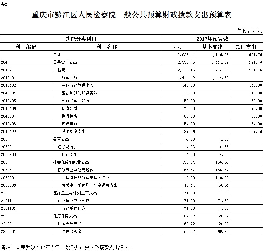2017年一般公共预算财政拨款收入2638.14万元,一般公共预算财政拨款支出2638.14万元,比2016年增加1220.84万元。其中:基本支出1716.38万元,比2016年增加637.08万元,主要原因是保障标准调整,主要用于保障在职人员工资福利及社会保险缴费、离退休人员离退休费及生活补助,保障部门正常运转的各项商品服务支出;项目支出921.76万元,比2016年增加583.76万元,主要原因是办案业务经费增加,主要用于查办和预防职务犯罪、公诉和审判监督、侦查监督、执行监督、控告申诉、检察室运行、环保资源类案件集中办理等重点工作。