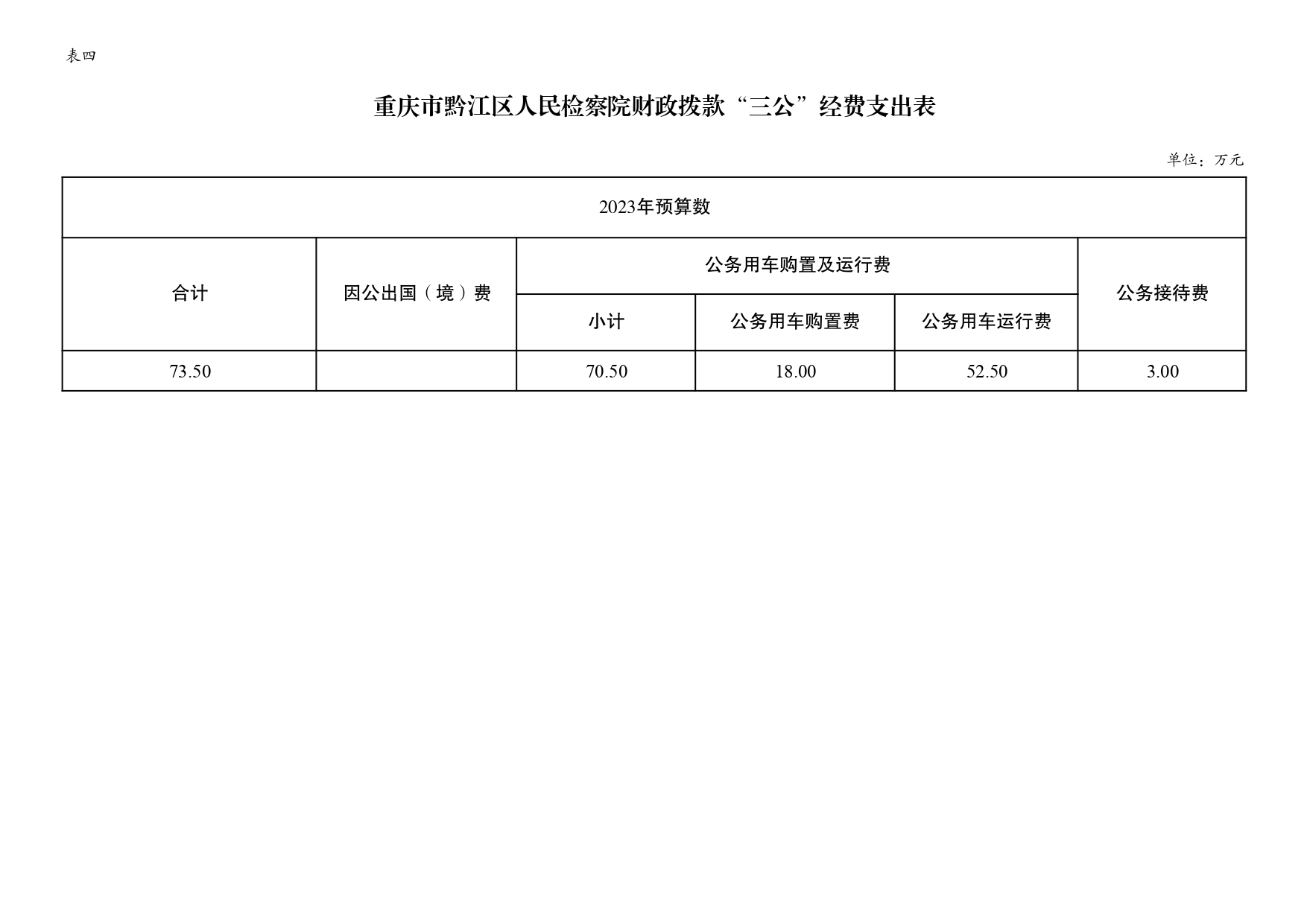 2023年财政拨款安排的“三公”经费预算73.5万元,比上年增加10.5万元,其中:因公出国(境)费用0万元,与上年持平;公务接待费3万元,与上年持平;公务用车运行维护费52.5万元,比上年减少7.5万元,主要原因是我院严格落实八项规定,严控公务用车标准;公务用车购置18万元,比上年增加18万元,主要原因是2023年我院预计新购置执法执勤车1辆。