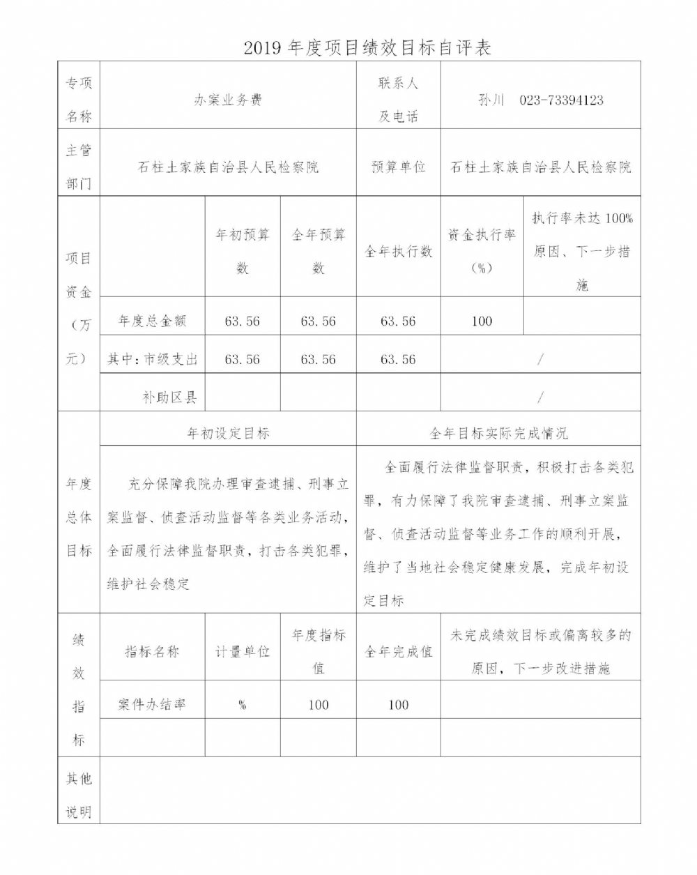 办案业务费项目绩效目标自评综述:根据年初设定的绩效目标,项目总体完成情况较好,各项绩效指标全部完成,实现了年初设定目标。项目全年预算数为63.56万元,执行数为63.56万元,完成预算的100.0%。主要产出和效果:通过实施该项目,我院充分履行法律监督职责,积极打击各类犯罪,有力保障了我院审查逮捕、刑事立案监督、侦查活动监督等业务工作的顺利开展。发现的问题及原因:项目预算编制不够精细合理,年末存在资金缺口的情况。主要原因是项目预算编制未充分掌握本院各部室办案办公经费需求情况。下一步改进措施:制定完善的部门预算管理制度,加强与本院各部室沟通,充分预算各部室办案规模,精确编制全年项目预算,确保项目经费充足,同时又避免因项目经费预算过多而导致预算执行率低的问题。