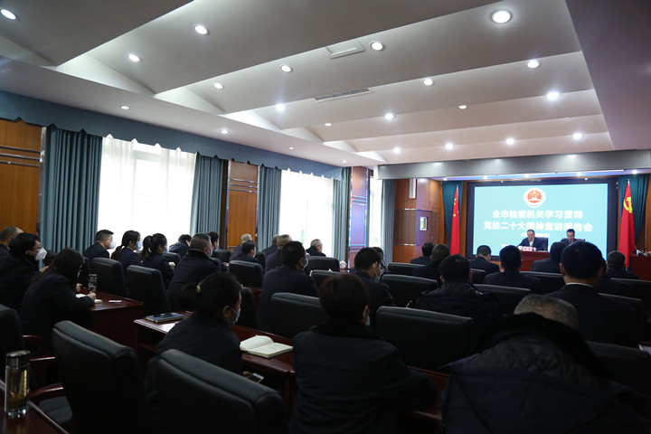 为深入学习宣传贯彻党的二十大精神,1月11日,市检察院政治部综合室主任周亮一行受市院党组委托,到我院宣讲党的二十大精神。我院党组书记、检察长刘少谷主持会议,全体院党组成员、检委会专职委员及干警参会。