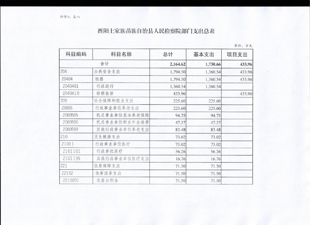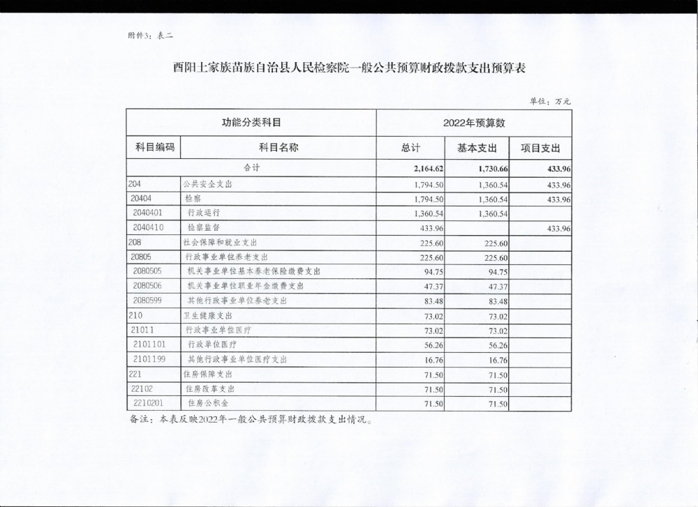 一、单位基本情况 (一)职能职责 酉阳土家族苗族自治县人民检察院是国家法律监督机关,依照法律规定在辖区范围内对有关刑事案件行使侦查权;对刑事案件进行审查,批准或者决定是否逮捕犯罪嫌疑人;对刑事案件进行审查,对决定提起公诉的案件支持公诉;依照法律规定提起公益诉讼;对诉讼活动实行法律监督;对判决、裁定等生效法律文书的执行工作实行法律监督;对看守所的执法活动实行法律监督;法律规定的其他职权。 (二)单位构成 本单位设置了检察一部、检察二部、检察三部、检察四部、检察五部、检察六部、政治部、办公室及龙潭检察室。 二、部门收支总体情况 (一)收入预算:2022年年初预算数2164.62万元,其中:一般公共预算拨款2164.62万元,政府性基金预算拨款0万元,国有资本经营预算收入0万元,事业收入0万元,事业单位经营收入0万元,其他收入0万元;收入较去年增加161.62万元,主要是一般公共预算拨款增加161.62万元。 (二)支出预算:2022年年初预算数2164.62万元,其中:一般公共安全支出支出1794.50万元,教育支出0万元,社会保障和就业支出225.60万元,卫生健康支出73.02万元,住房保障支出71.50万元;支出较去年增加161.62万元,主要是基本支出增加95.66万元,项目支出增加65.96万元。 三、部门预算情况说明 2022年一般公共预算财政拨款收入2164.62万元,一般公共预算财政拨款支出2164.62万元,比上年增加161.62万元,其中:基本支出1730.66万元,比上年增加95.66元,主要原因是人员增加及政策性增资,主要用于保障在职人员工资福利及社会保险缴费,退休人员补助等,保障部门正常运转的各项商品服务支出;项目支出433.96万元,比上年增加65.96万元,主要原因是新建智慧案管大厅,主要用于提升检察案管大厅信息化水平,提高接访质量。 酉阳土家族苗族自治县人民检察院2022年未使用政府性基金预算拨款安排的支出,与上年保持一致。 四、“三公”经费情况说明 2022年“三公”经费预算51万元,比上年减少12万元,其中:因公出国(境)费用0万元,比上年增加0万元,主要原因是2022年未安排因公出境事宜;公务接待费3万元,比上年减少12万元,主要原因是落实中央过紧日子要求,严格规范控制公务接待费;公务用车运行维护费48万元,比上年增加0万元,主要原因是2022年未新增公务用车,公务用车运行维护费保持不变;公务用车购置0万元,比上年增加0万元,主要原因是2022年,机关公务车仍在使用年限内,无新购车辆安排。 五、其他重要事项的情况说明 1.机关运行经费。2022年一般公共预算财政拨款运行经费475.81万元,比上年增加19.31万元,主要原因为单位在编人员变动。主要用于办公费、印刷费、邮电费、物管费、差旅费、会议费、培训费及其他商品和服务支出等。 2.政府采购情况。所属各预算单位政府采购预算总额0万元,其中:政府采购货物预算0万元,政府采购工程预算0万元,政府采购服务预算0万元。一般公共预算拨款政府采购0万元,其中:政府采购货物预算0万元,政府采购工程预算0万元,政府采购服务预算0万元。 3.绩效目标设置情况。2022年项目支出均实行了绩效目标管理,涉及一般公共预算当年财政拨款433.96万元。 4.国有资产占有使用情况。截止2021年12月,所属各预算单位共有车辆12辆,其中一般公务用车0辆、执勤执法用车12辆,2022年一般公共预算安排购置车辆0辆,其中一般公务用车0辆,执法执勤用车0辆。 六、专业性名词解释 (一)财政拨款收入:指本年度从本级财政部门取得的财政拨款,包括一般公共预算财政拨款和政府性基金预算财政拨款。 (二)其他收入:指单位取得的除“财政拨款收入”、“事业收入”、“经营收入”等以外的收入。 (三)基本支出:指为保障机构正常运转、完成日常工作任务而发生的人员经费和公用经费。 (四)项目支出:指在基本支出之外为完成特定行政任务和事业发展目标所发生的支出。 (五)“三公”经费:指用一般公共预算财政拨款安排的因公出国(境)费、公务用车购置及运行维护费、公务接待费。其中,因公出国(境)费反映单位公务出国(境)的国际旅费、国外城市间交通费、住宿费、伙食费、培训费、公杂费等支出;公务用车购置费反映单位公务用车购置支出(含车辆购置税);公务用车运行维护费反映单位按规定保留的公务用车燃料费、维修费、过路过桥费、保险费、安全奖励费用等支出;公务接待费反映单位按规定开支的各类公务接待(含外宾接待)支出。 单位预算公开联系人:张浥通 联系方式:023-75532685