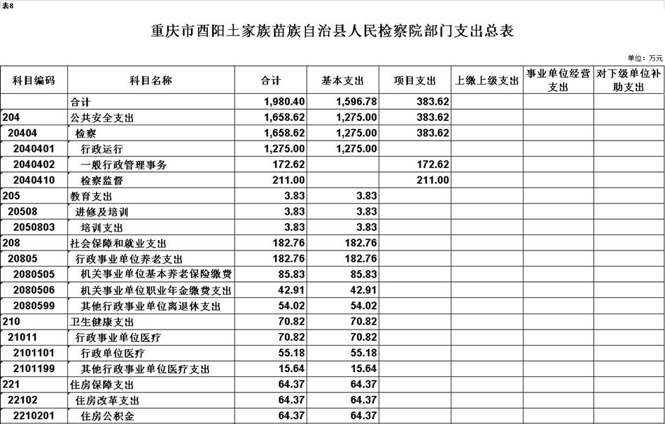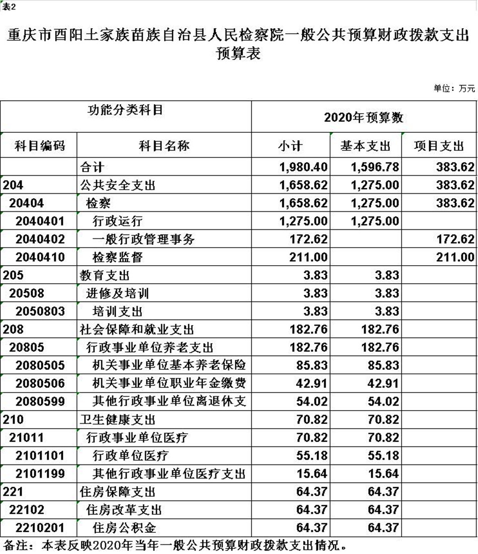 (二)支出预算:2020年年初预算数1980.4万元,其中:公共安全支出预算1658.62万元,教育支出预算3.83万元,社会保障和就业支出预算182.76万元,卫生健康支出预算70.82万元,住房保障支出预算64.37万元。支出预算较去年减少186.03万元,主要是基本支出预算减少218.23万元,项目支出预算增加32.2万元。
