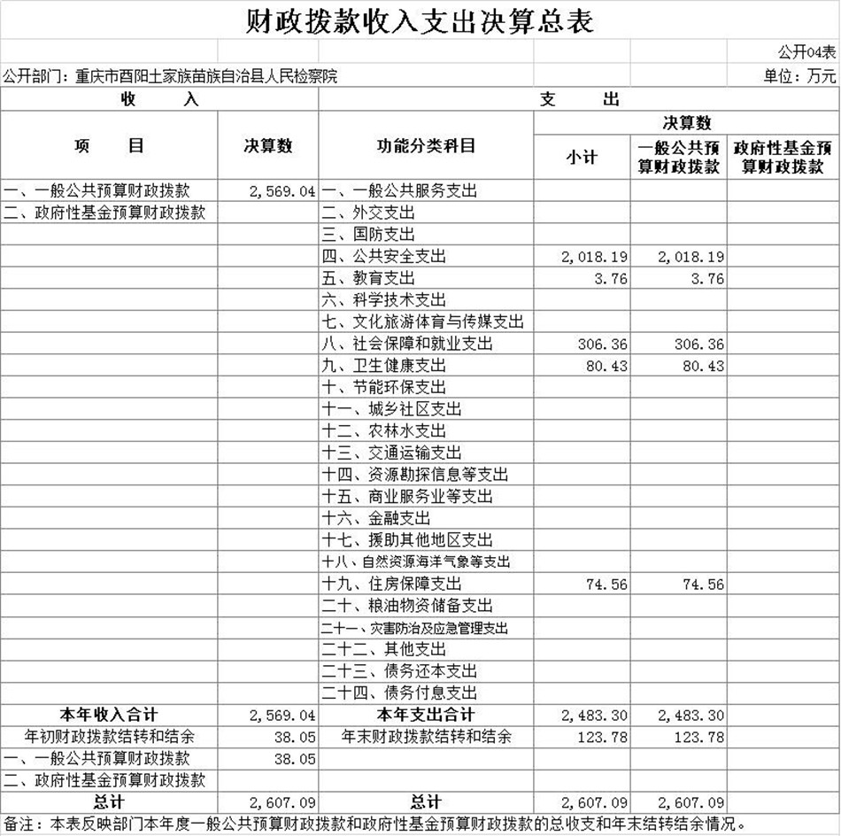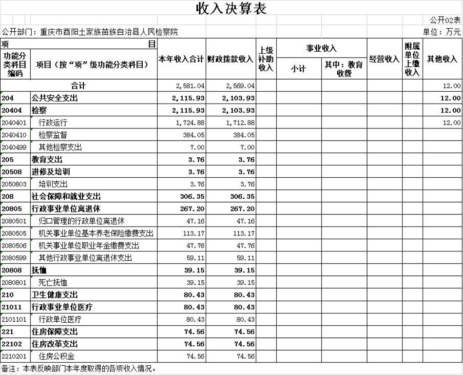 1.收入情况。2019年度一般公共预算财政拨款收入2,569.04万元,较上年决算数增加234.39万元,增长10.0%,主要原因是政策性增资及政府目标奖的及时发放。较年初预算数增加402.61万元,增长18.6%,主要原因是年中追加政府目标奖、退休休养费、退休干警死亡抚恤金、司法救助金、办案业务费等。此外,年初财政拨款结转和结余38.05万元。
