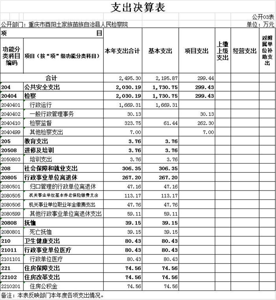 2.支出情况。2019年度一般公共预算财政拨款支出2,483.3万元,较上年决算数增加79.35万元,增长3.3%,主要原因一是发放退休干警死亡抚恤金;二是政府目标奖及退休休养费的及时发放。较年初预算数增加316.87万元,增长14.6%,主要原因是年中追加政府目标奖、退休休养费、退休干警死亡抚恤金、司法救助金、办案业务费等。