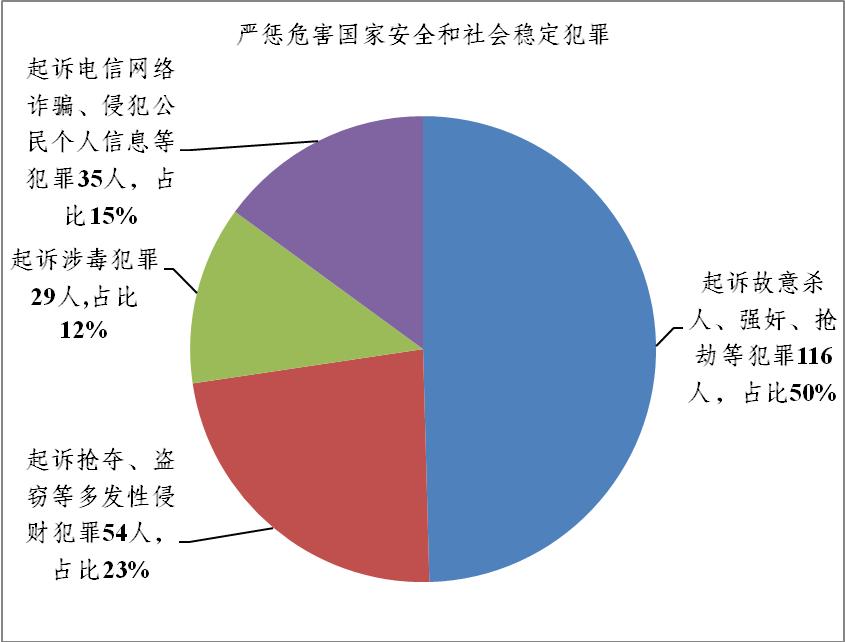刑事检察稳中有进。坚持以维护社会和谐稳定为使命,深化扫黑除恶专项斗争工作,统筹调配办案力量,深入开展“六清”行动,坚决夺取扫黑除恶专项斗争全面胜利,促进社会治理完善。起诉恶势力团伙犯罪1件9人,移送“保护伞”线索1件2人。依法严厉打击各种严重刑事犯罪活动,严惩危害群众身体健康和生命安全的犯罪,共受理公安机关提请批准逮捕案件139件248人,批准逮捕116件200人,受理移送审查起诉案件349件572人,提起公诉261件413人。秉持客观公正立场,既做犯罪的追诉者,又做无辜的保护者。在立案、侦查、审判等环节严格把关,监督公安机关立案2件5人,撤案28件,决定追捕3件5人,追诉漏罪漏犯23人次,对犯罪情节轻微的依法决定不起诉52人,确保不偏不倚、不枉不纵。强化刑事执行同步监督,纠正监外执行中的违法情形23人,办理羁押必要性审查案件20件20人。强化与监察机关的协调配合,积极稳妥办理职务犯罪案件,共受理县监委移送起诉职务犯罪案件4件4人,决定逮捕并向法院提起公诉4人,彰显反腐决心。