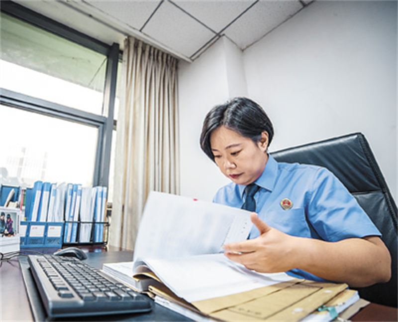 梅玫在办公室内查阅卷宗。