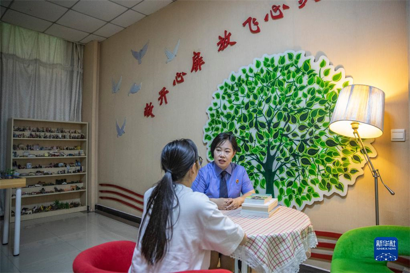 9月20日,在重庆市大渡口区人民检察院“莎姐”谈心室内,梅玫与一名前来咨询的未成年人谈心。新华社记者 黄伟 摄