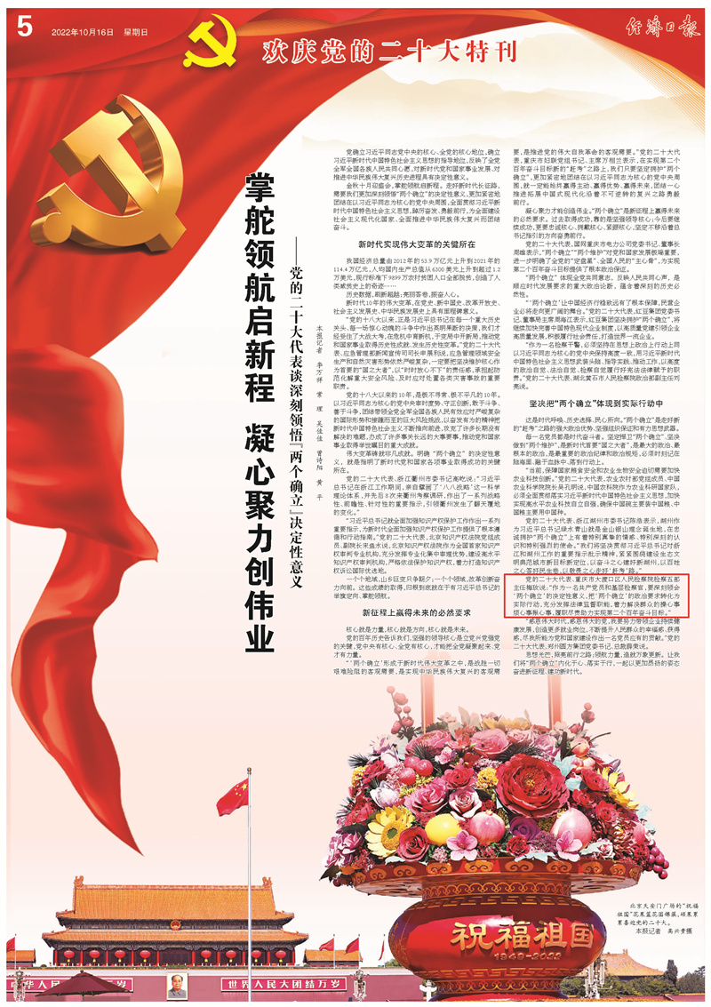 金秋十月迎盛会,掌舵领航启新程。走好新时代长征路,需要我们更加深刻领悟“两个确立”的决定性意义,更加紧密地团结在以习近平同志为核心的党中央周围,全面贯彻习近平新时代中国特色社会主义思想,踔厉奋发、勇毅前行,为全面建设社会主义现代化国家、全面推进中华民族伟大复兴而团结奋斗。