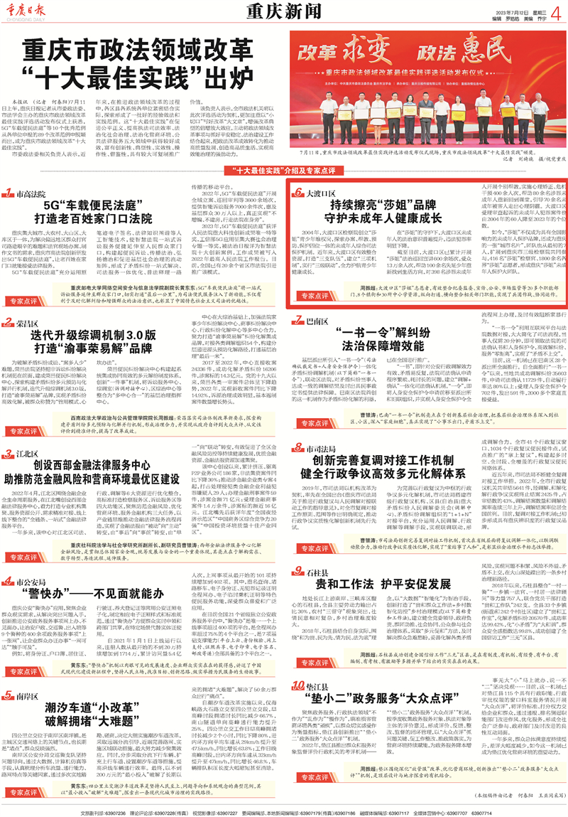 本报讯 (记者 何春阳)7月11日上午,重庆日报记者从市委政法委、市法学会主办的重庆市政法领域改革最佳实践评选活动发布仪式上获悉,5G“车载便民法庭”等10个优秀范例从各单位申报的89个改革范例中脱颖而出,成为重庆市政法领域改革“十大最佳实践”。