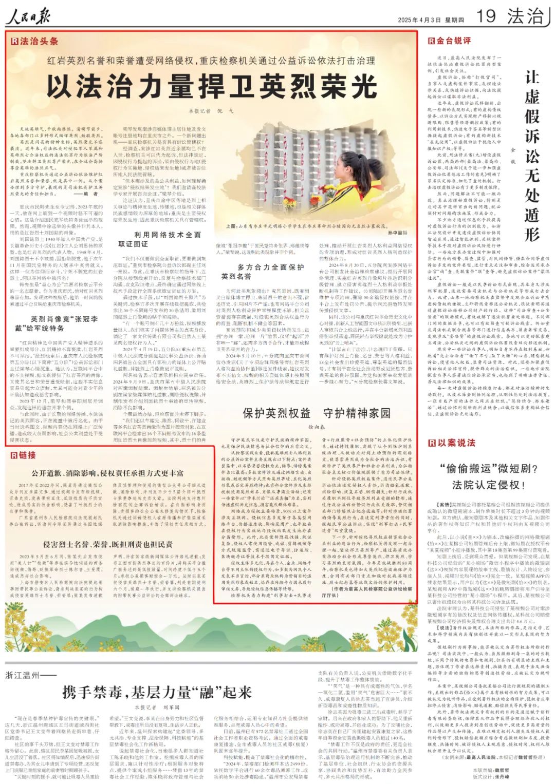 2025年4月3日,《人民日报》第19版“法治头条”专栏刊登《红岩英烈名誉和荣誉遭受网络侵权,卡提诺论坛