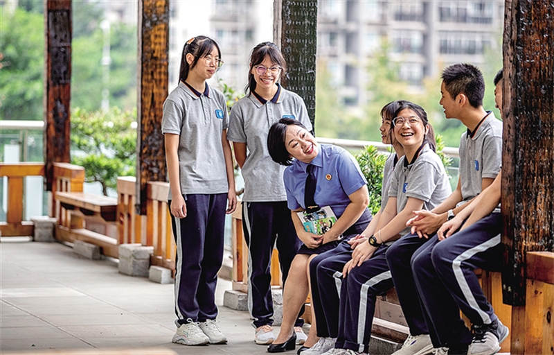九月二十日,在重庆市第三十七中学,梅玫与学生在课间交流。