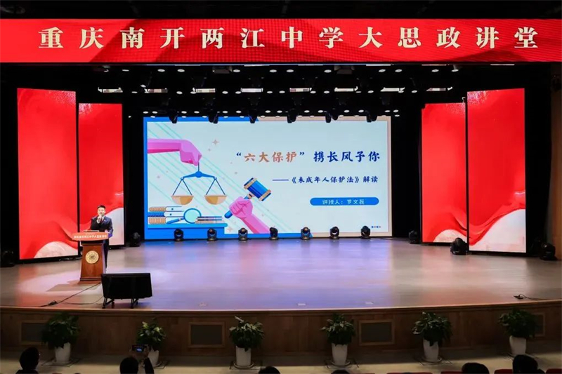 为深入贯彻习近平总书记关于未成年人保护工作重要指示精神,推进《中华人民共和国未成年人保护法》校园普及,增强未成年人法律意识及自我保护意识,护航未成年人健康成长,3月16日,大渡口区检察院“莎姐”青少年维权岗副主任罗文磊走进重庆南开两江中学,为学校2025届同学们带来了一场题为“‘六大保护’携长风予你——《未成年人保护法》解读”的法治专题宣讲。