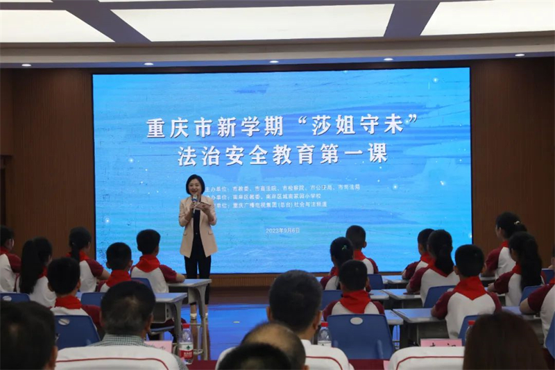 为高质量纵深推进我市“莎姐守未”专项行动,加强青少年法治教育,提升青少年法治意识和自护能力,9月6日,重庆市检察院会同市教委、市高法院、市公安局、市司法局在南岸区城南家园小学校开讲重庆市新学期“莎姐守未”法治安全教育第一课。“莎姐”检察官、法官、心理专家通过情景式法治微课、闯关互动等形式,围绕防网络沉迷、防性侵、防欺凌以及心理健康等话题,为该校2300余名学生和家长带来一堂生动的法治课。次日,该课程还通过视频形式面向全市小学五年级到高中二年级的所有学生进行展播。