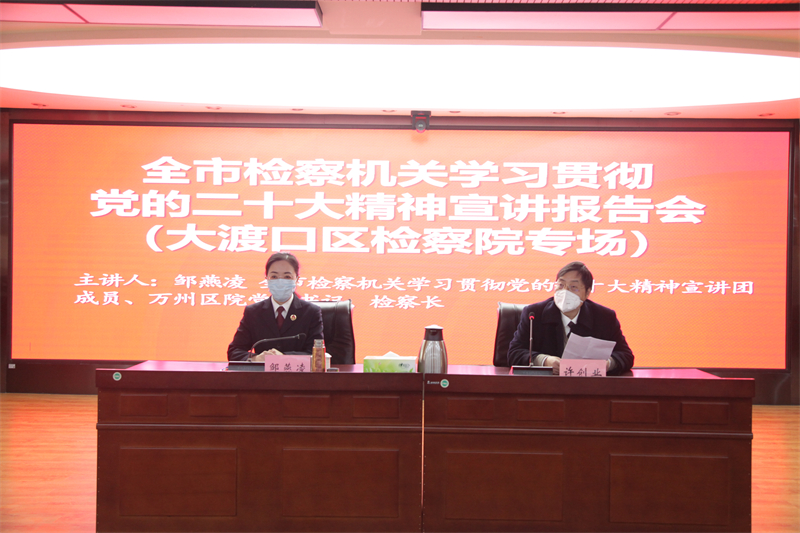 会上,大渡口区委党的二十大精神宣讲团成员、大渡口区检察院检察五部主任梅玫同志围绕党的二十大的主题和主要成果、过去五年的工作和新时代十年的伟大变革、马克思主义中国化时代化等新观点、新论断、新思想,讲认识、谈感悟,讲贯彻、谈落实,带动全体检察人员深刻领会宗旨要义。