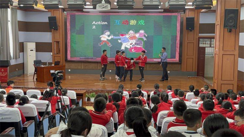 活动现场,宋志锋还邀请几名同学上台玩起了互动游戏,通过角色扮演,让同学们直观感受平常打闹嬉戏和校园欺凌暴力之间的区别。刚开始,几名同学在一起推来推去玩,大家还嘻嘻哈哈,随着推搡的力度变大,被推的同学逐渐变得愤怒起来,“你们凭什么要来推我呢?我又没有惹你们!”