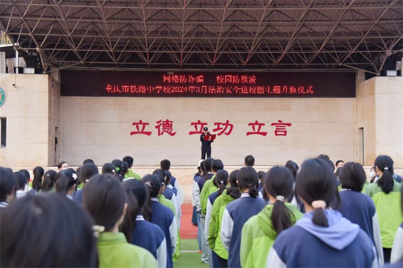 在全国中小学生安全教育日来临之际,重庆市铁路中学全校学生迎来了一场特殊的升旗仪式:在学校开展的“网络防诈骗 校园防欺凌”法治安全进校园主题活动上,九龙坡区公安分局黄桷坪派出所所长陈国江受邀现场为同学们进行了安全知识讲解。
