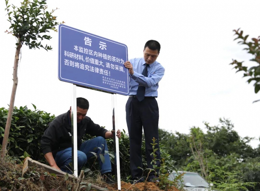 6月3日,重庆市农科院茶叶研究所的茶园里有了新变化——“本监控区内种植的茶叶为科研材料,价值重大,请勿采摘,否则将追究法律责任!”8块告知牌立于绿油油的茶树之间,落款还署有永川区检察院知识产权办公室、区农委以及区云岭茶研所3家单位的名字。