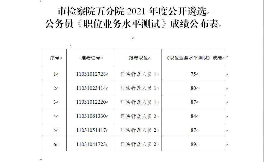 市检察院五分院2021年度公开遴选公务员《职位业务水平测试》成绩公布表