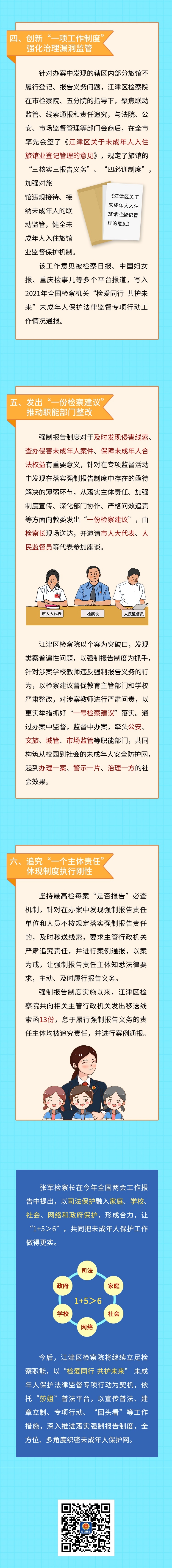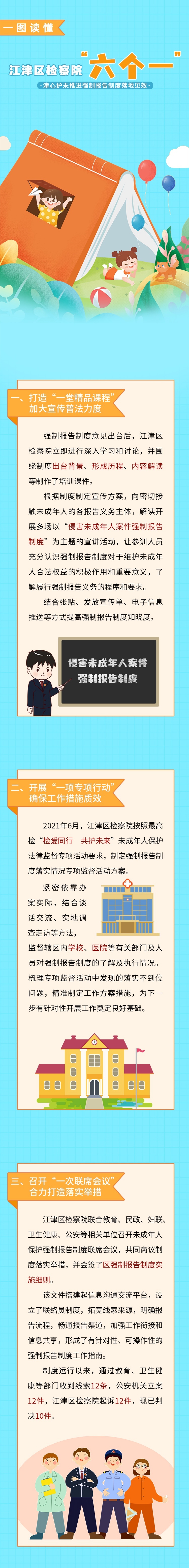 为落实最高检等九部门联合印发《关于建立侵害未成年人案件强制报告制度的意见(试行)》要求,根据重庆市检察院等九部门联合出台的强制报告制度实施办法,江津区检察院充分发挥检察职能,强化未成年人综合司法保护,以“六个一”工作措施为主线,推动侵害未成年人案件强制报告制度落实见效。