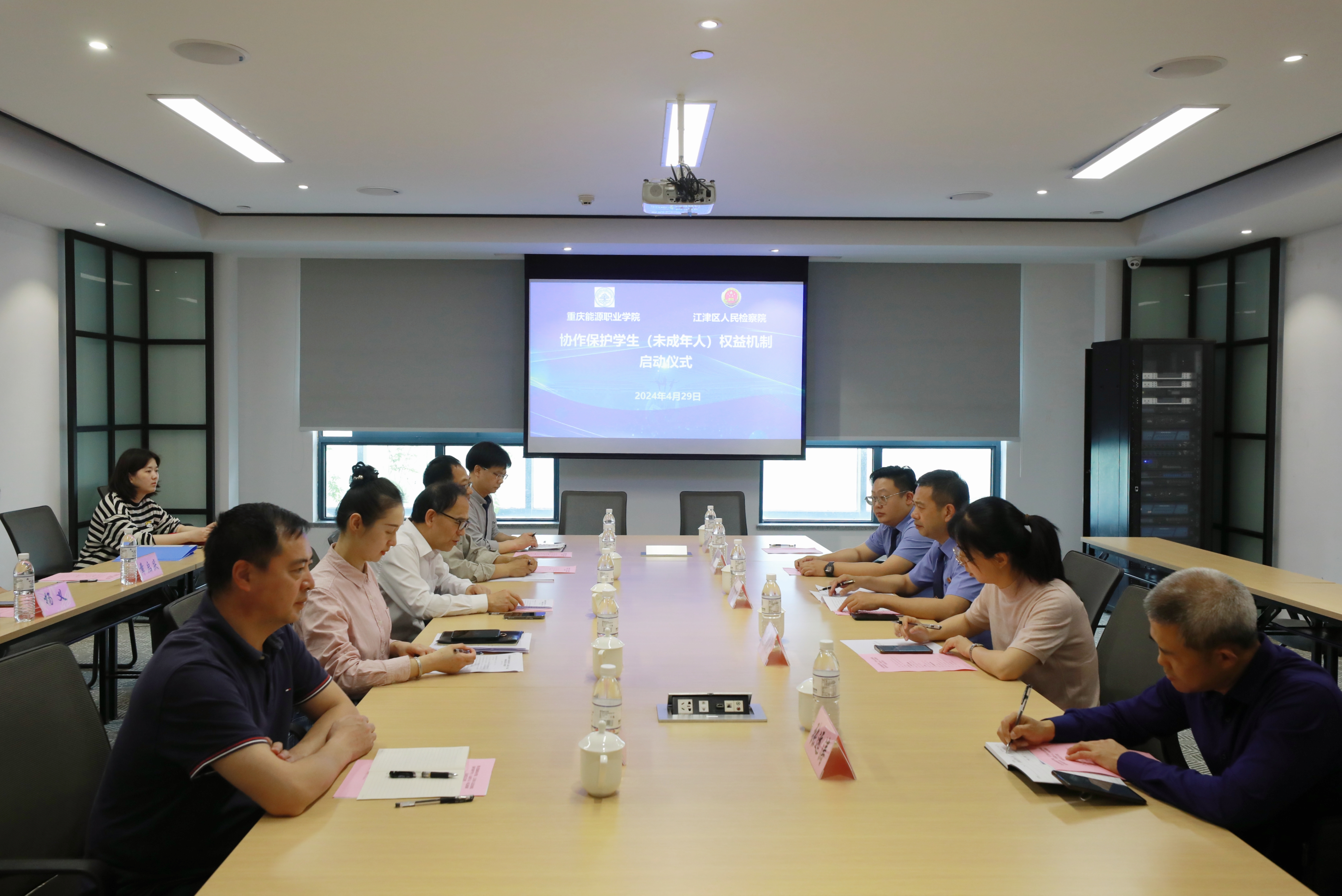 江津区检察院党组成员、副检察长谢增益与重庆能源职业学院校长杨和平签署《协作保护学生(未成年人)权益机制》,随后双方就具体共建事宜进行了座谈交流。
