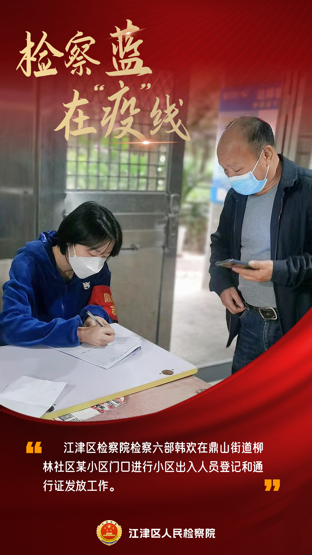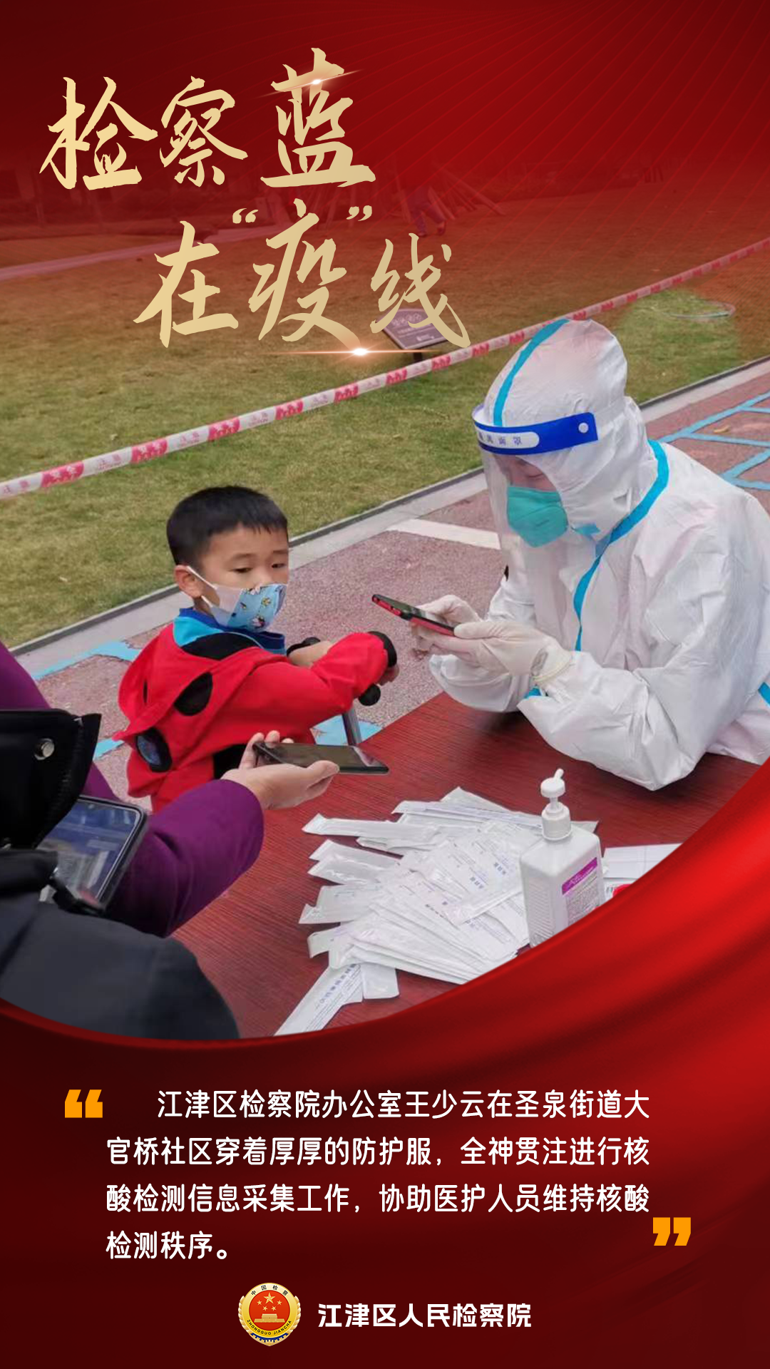 截止目前,江津区检察院居家办公干部职工下沉到辖区内22个社区、65个小区疫情防控工作一线,开展志愿服务445人次,配合社区工作人员认真做好核酸检测秩序维护、重点人员摸排、志愿服务等各项工作,确保核酸检测工作有序开展,为打赢疫情防控歼灭战贡献检察力量。