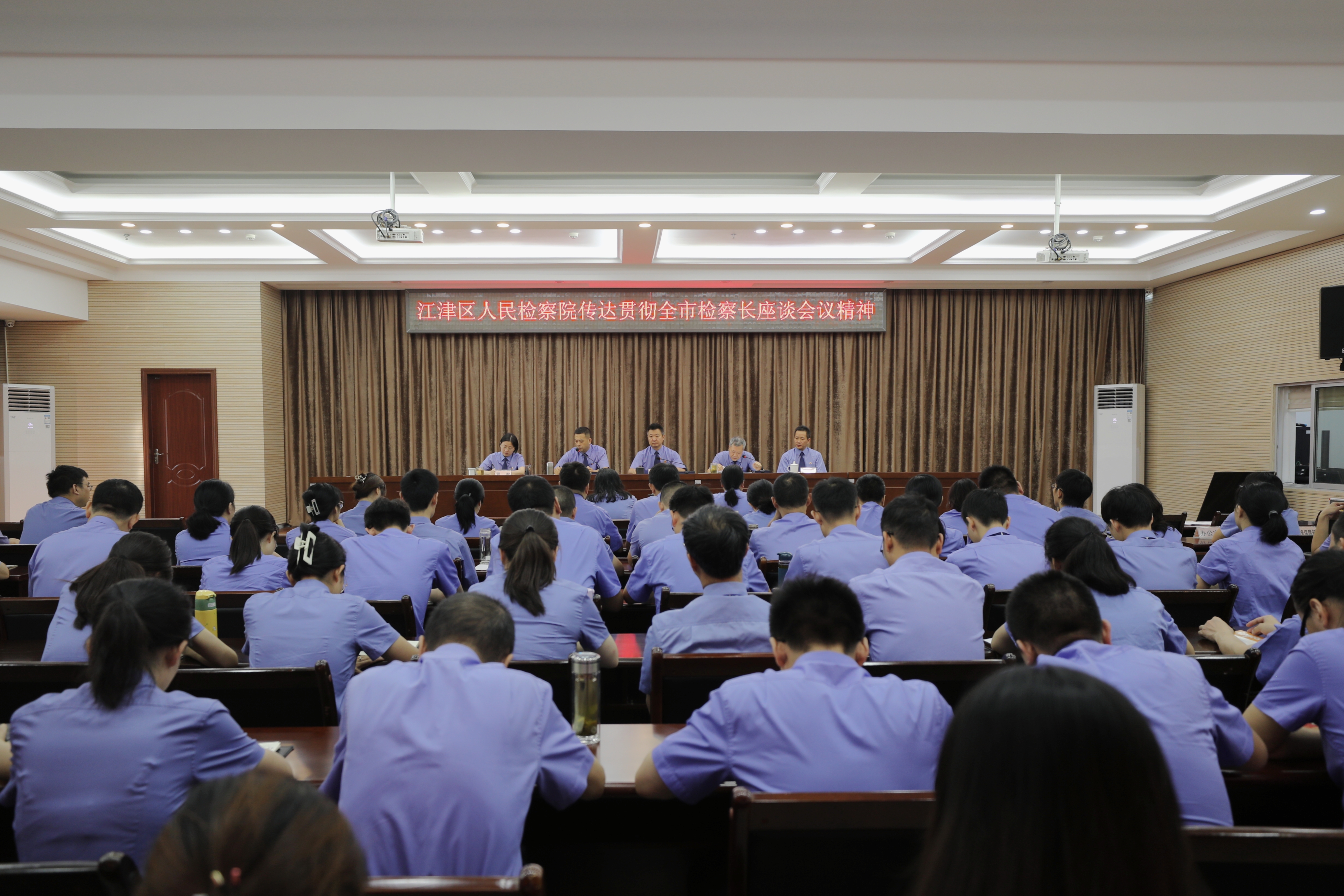 为进一步贯彻落实大检察官研讨班及全市检察长座谈会议精神,持续深化落实市五检会“2266”工作体系要求,8月1日,江津区检察院召开全院干警大会,传达学习贯彻全市检察长座谈会议精神,结合江津区检察院上半年业务质效情况,谋划部署下阶段工作重点。