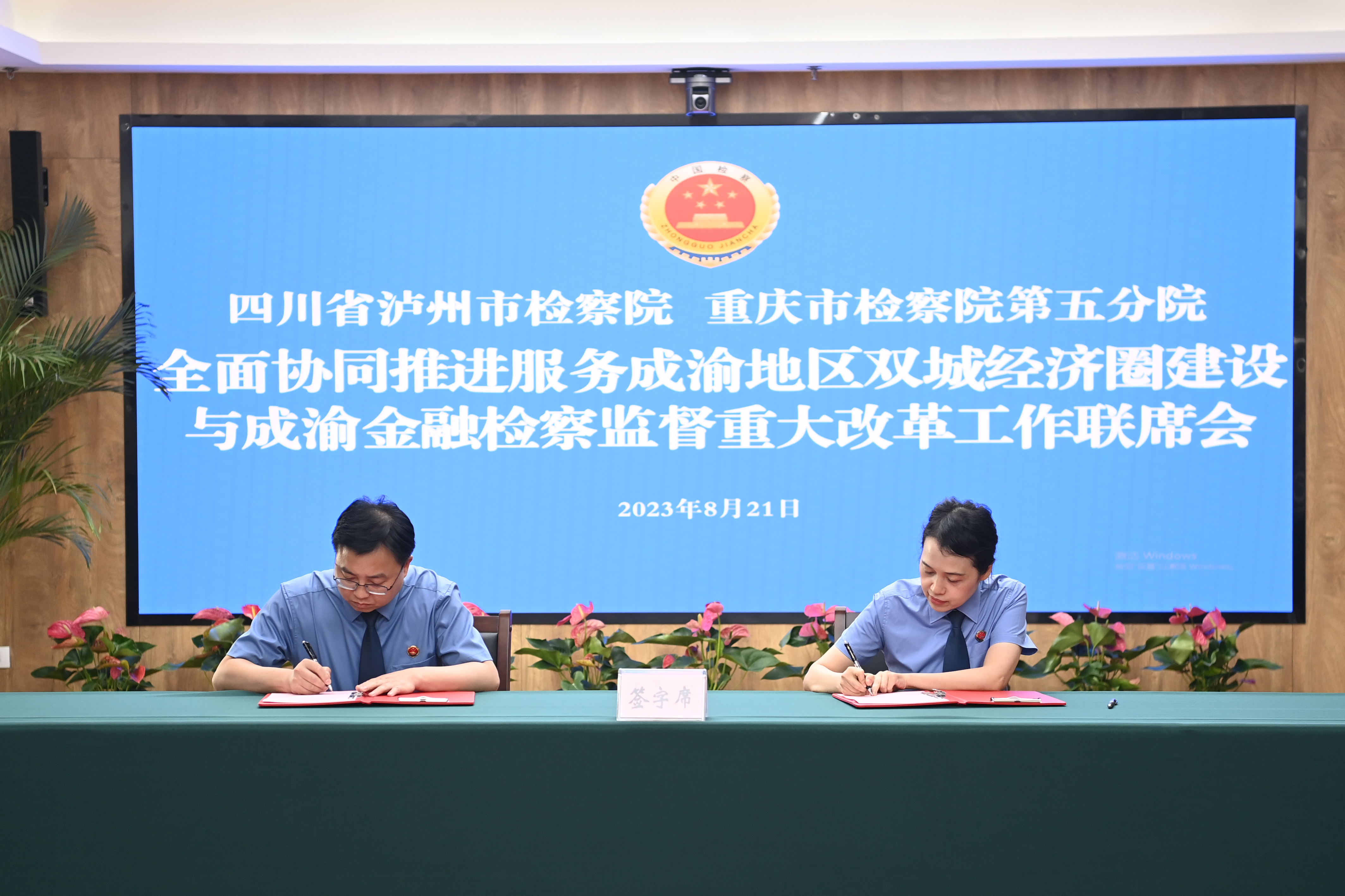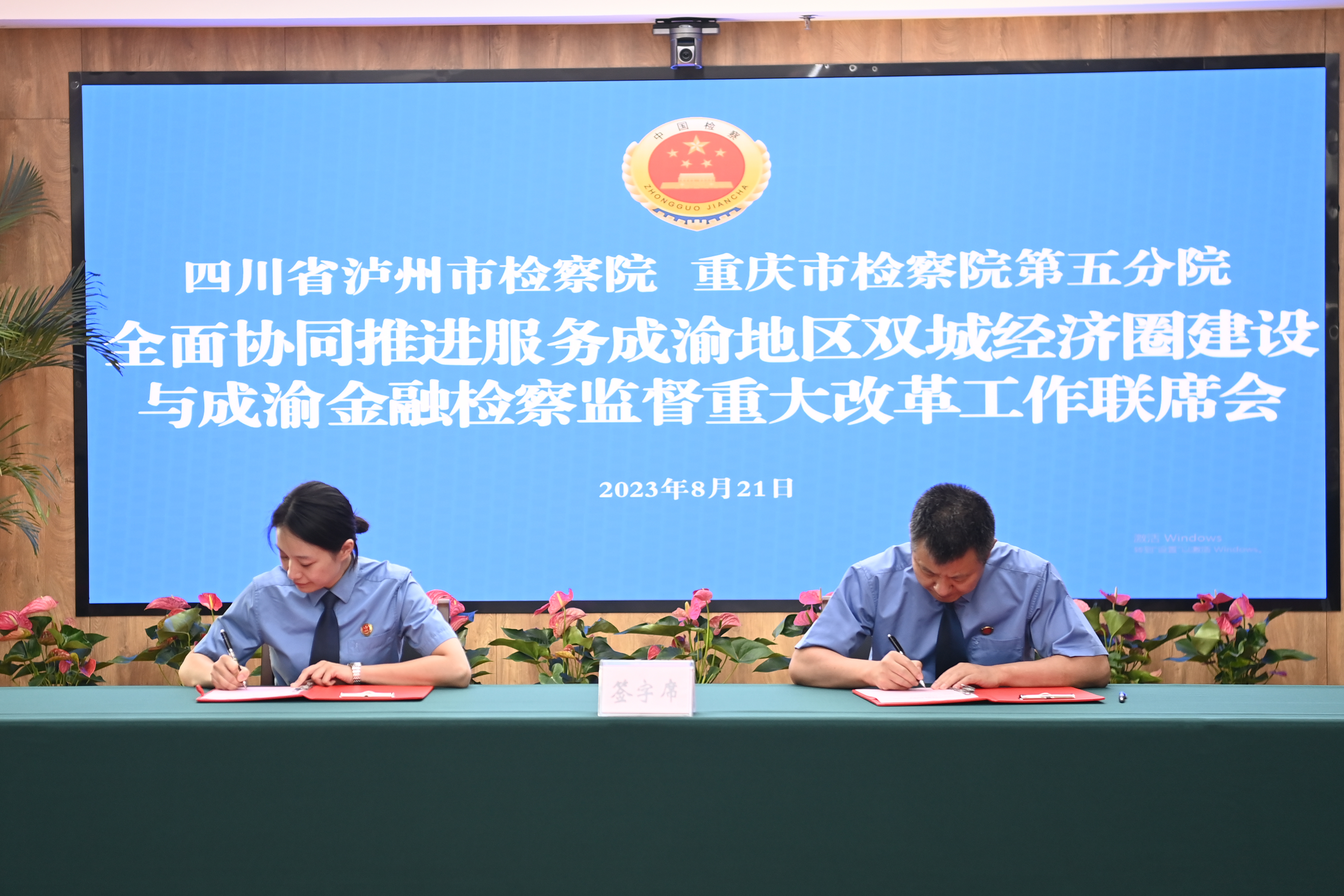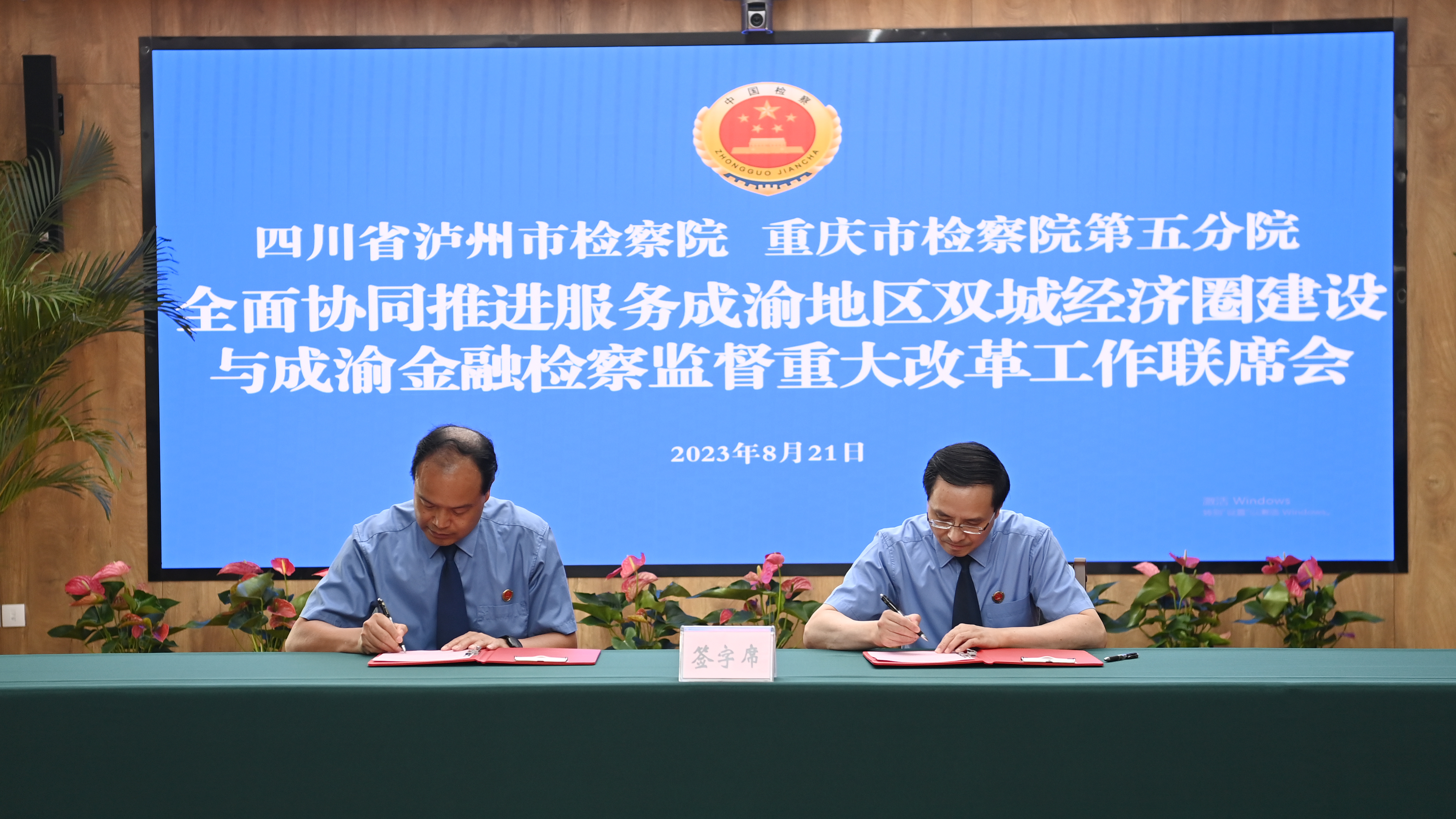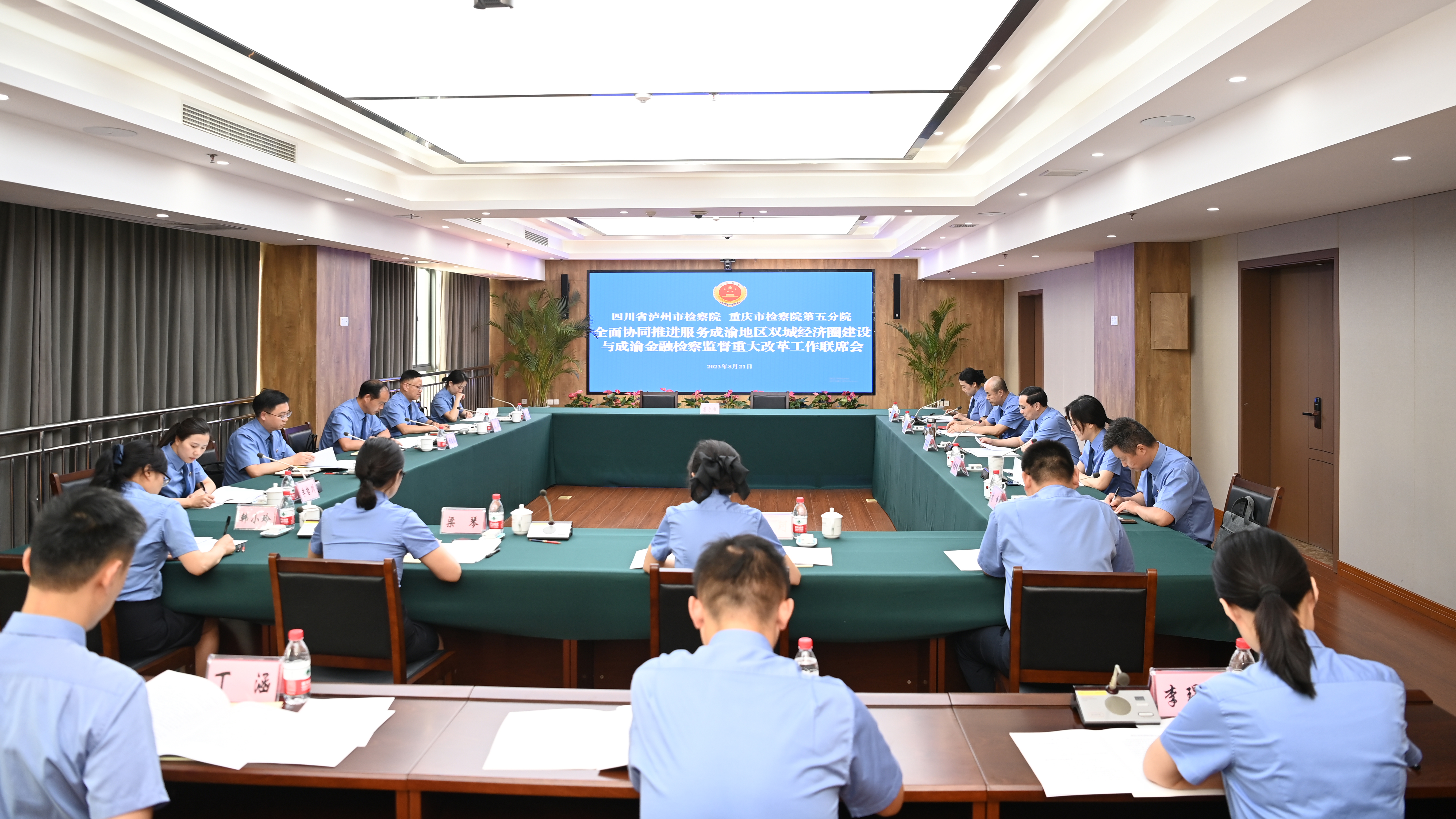 为认真贯彻党中央关于建设成渝地区双城经济圈重大战略决策部署,切实落实好四川省检察院与重庆市检察院签订的《关于加强检察协作服务保障成渝地区双城经济圈建设的意见》(以下简称《意见》)和《关于加强成渝金融法院法律监督工作相关问题的会议纪要》(以下简称《纪要》)要求,更好服务成渝地区双城经济圈建设、泸永江融合发展示范区建设,推进跨省域检察监督重大改革,2023年8月21日下午,重庆市检察院第五分院(以下简称五分院)与四川省泸州市检察院召开全面协同推进服务成渝地区双城经济圈建设和成渝金融检察监督重大改革联席会议。