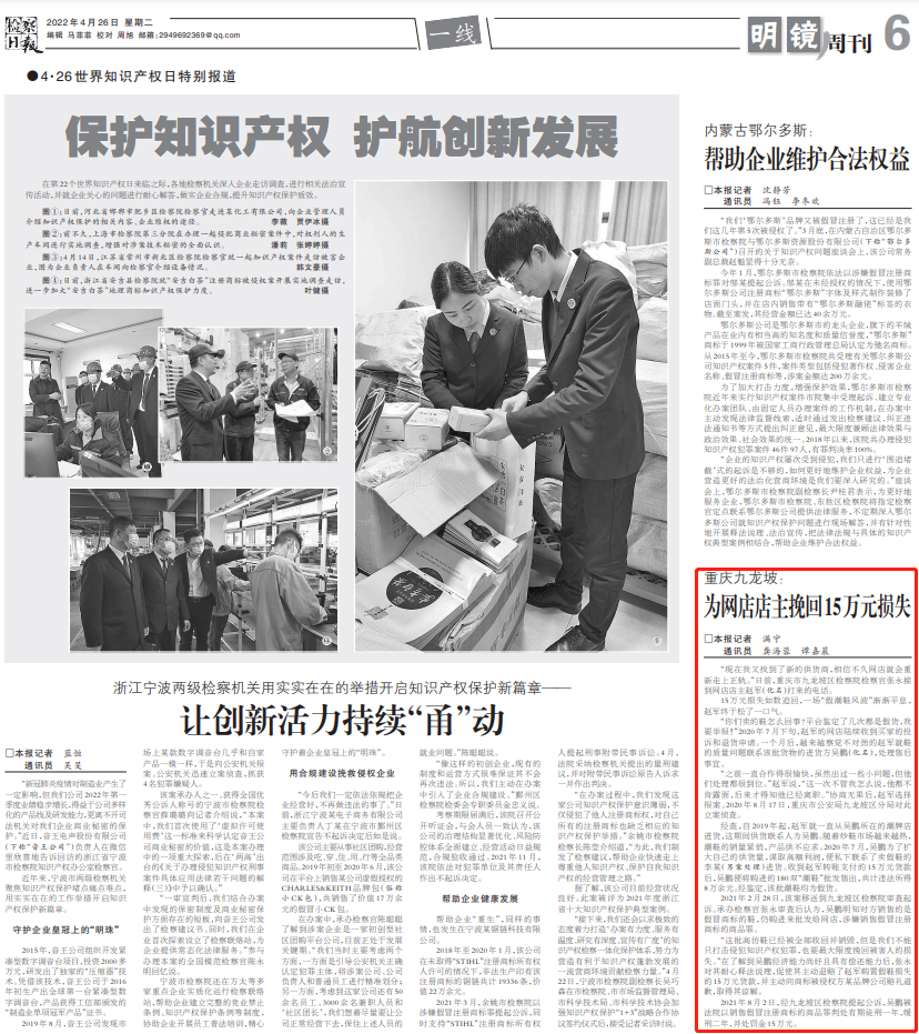 2022年4月26日,《检察日报》第6版刊登《重庆九龙坡:为网店店主挽回15万元损失》一文,内容如下: