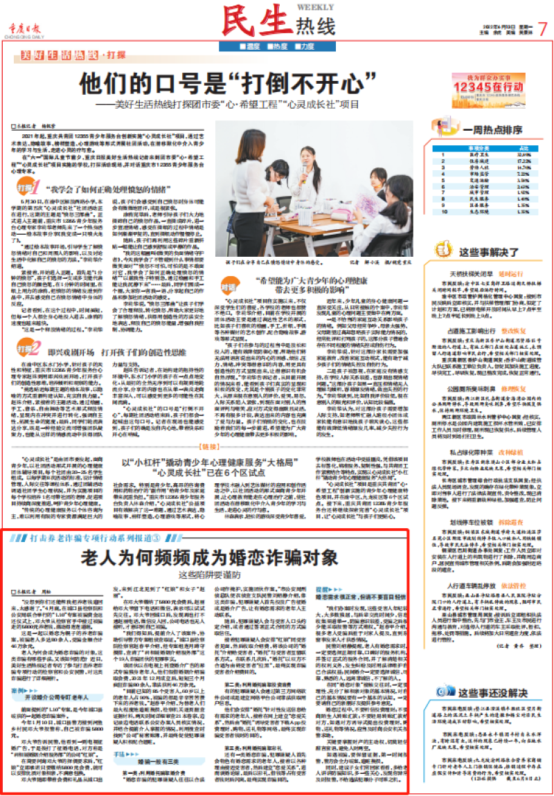 前面提到的“1.10”专案,是今年城口县破获的一起婚恋诈骗案件。 今年1月10日,城口县警方接到河鱼乡村民邓大爷报警称,自己被诈骗5800元。 邓大爷告诉民警,他看到一则电视征婚广告,于是拨打了征婚电话,对方称是“君相媛婚姻介绍服务部”的公司“红娘”。 在简要问询邓大爷的择偶要求后,“红娘”立即承诺只要缴纳5800元会费,就可以安排优质对象相亲,不满意包换。 邓大爷随即带着会费和礼品从城口出发,来到江北见到了“红娘”和女子“赵丽”。 在邓大爷缴纳了5800元会费后,赵丽给邓大爷留下电话和微信,表示可以试试先交往。邓大爷回城口后,发现再也打不通赵丽电话,微信没人回,公司电话也无人接听,才意识到自己被骗。 “我们得知后,提前介入了该案件,协助引导警方专案组侦查取证。”城口县检察院检察官赵春平介绍,经专案组连月蹲守摸排,查清了“君相媛婚姻介绍服务部”这个19人诈骗团伙的犯罪事实。 该团伙以在电视上刊登婚介广告的形式专骗独身老年人,他们假借婚姻介绍骗取会费,2021年12月成立后,短短三个月疯狂诈骗80余人,非法获利46万余元。 “目前已知的85个受害人,60岁以上的老年人占90%,被骗的都是辛辛苦苦攒下来的养老钱。”赵春平介绍,为替老人们最大程度地追赃挽损,检察机关逐页翻查证据材料,两天时间详细审查21本卷宗,边记录边电话联系公安办案人员核实情况,并结合提前介入掌握的情况,利用搜查时找到“公司”秘密账簿,并最终促使犯罪嫌疑人积极配合退赃。 “婚恋诈骗的犯罪嫌疑人往往以合法公司作掩护,实施团伙作案。”市公安局刑侦总队便衣侦查支队民警刘绍静介绍,像这类诈骗,犯罪嫌疑人首先投放广告征婚或是婚介广告,让有婚恋需求的老年人主动联系。 随后,犯罪嫌疑人会与受害人口头约定介绍,或者通过签署正式合同的方式骗取信任。 接着犯罪嫌疑人会安排“红娘”同受害者见面,然后收取介绍费,将该公司的“婚托”介绍给受害者,“婚托”与受害者互留联系方式。在联系几次后,“婚托”以双方不合适为由将受害者“拉黑”,最终实现诈骗受害者介绍费目的。 有的犯罪嫌疑人会通过第三方网络软件公司或是建立网络平台公司非法获取用户信息。 他们会安排“婚托”针对性发送信息给有需求的老年人,接着在网上建立“恋爱关系”,然后由“婚托”诱导受害者下载App投资理财、购物、送礼物 等网络,最终实现诈骗受害者钱财的目的。 还有一类婚恋诈骗,犯罪嫌疑人首先会物色有婚恋需求的老年人,接着以各种理由接近受害者,然后建立“恋爱关系”,进而谈婚论嫁,最后以彩礼、借钱等占有受害者钱财后闪离,最终实现诈骗目的。 “我们办案时发现,这些受害人年纪较大,大多数独居,与后辈交流时间少,信息收集渠道单一,防骗意识较差,受骗之后很少能采取报警等方式维权。”赵春平介绍,很多老人受骗后羞于对家人提及,直到东窗事发家人才获悉情况。 民警刘绍静提醒,老人有婚恋需求时,一定要选择正规可靠、口碑好的服务机构,并签订正式的服务合同,并了解清楚相关的权利义务,发生纠纷及时用法律维护自己合法权益;民间婚介一定要选择诚信、可靠、熟悉的人,远离非诚信、不了解的人。 在同“婚恋对象”接触交往时,一定要理性,充分了解相亲对象的基本情况,对自己的基本情况要有一个基本的认知。一定要请自己的亲朋好友提供参考意见。 婚恋过程中,不要听信投资理财;不要向陌生人转账汇款;不要轻易转账汇款给对方,如遇对方诱导式提出投资理财、购物、送礼物等情况,应当及时向公安机关报警求助。 关键要掌握财产的主动权,切莫轻信甜言蜜语,避免人财两空。 如遇被骗,要保留证据,第一时间报警,警方会全力破案、追赃挽损。 同时,建议子女们常回家看看,多给老人讲讲防骗知识,多一些关心,发现你异常及时报警,不给违法犯罪分子可乘之机。