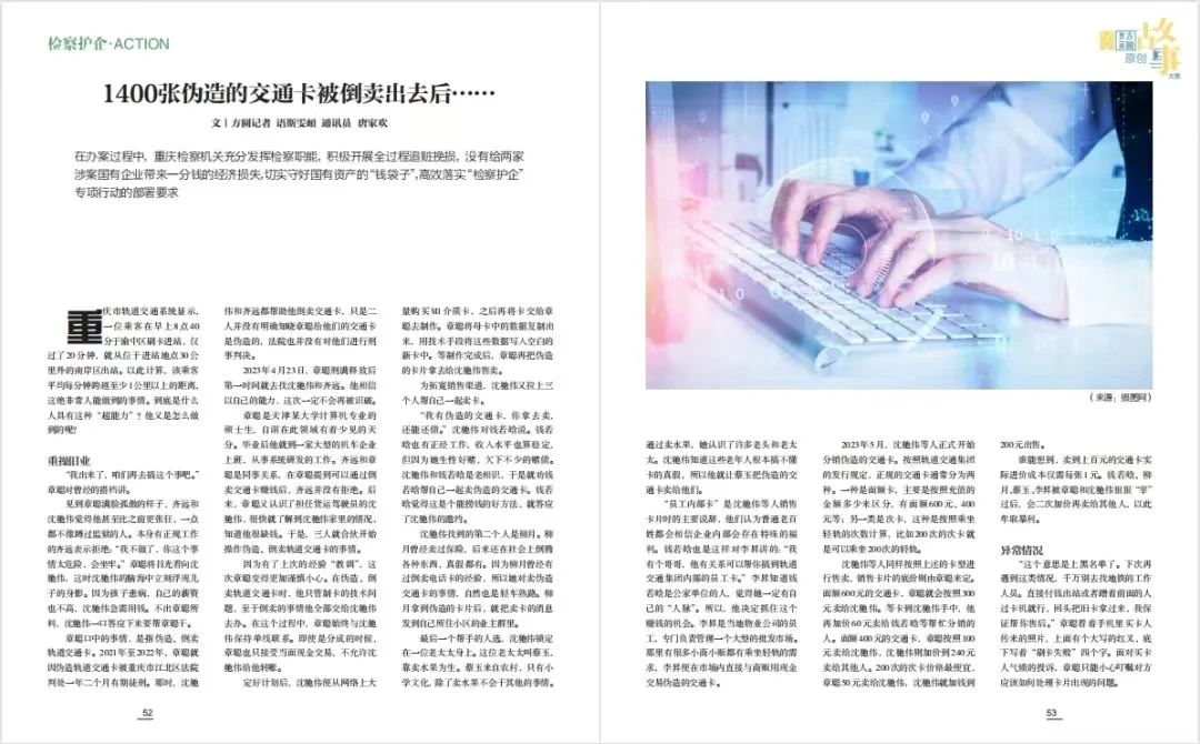 近日,最高检《方圆杂志》5月下期 总第673期“检察护企”专栏刊登《1400张伪造的交通卡被倒卖出去后……》一文,内容如下:
