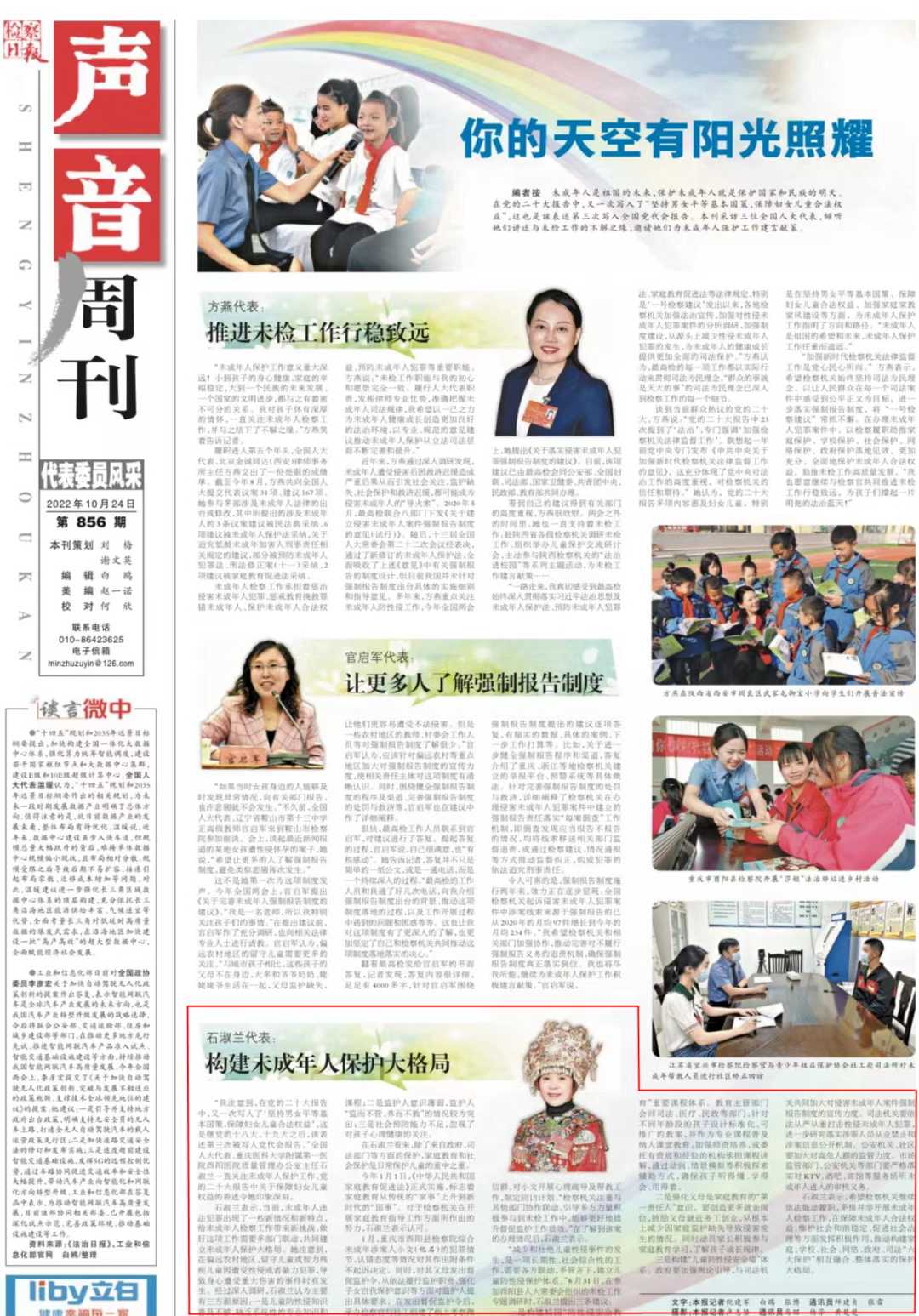 2022年10月24日,《检察日报》第6版刊登《石淑兰代表:构建未成年人保护大格局》一文,内容如下: