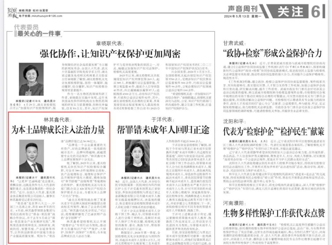 2024年5月13日,《检察日报》第6版“声音周刊”刊登《林其鑫代表:为本土品牌成长注入法治力量》一文,内容如下: