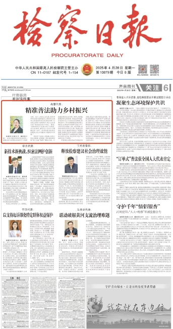 2025年4月28日,《检察日报》第6版刊登《冉慧代表:精准普法助力乡村振兴》一文,内容如下: