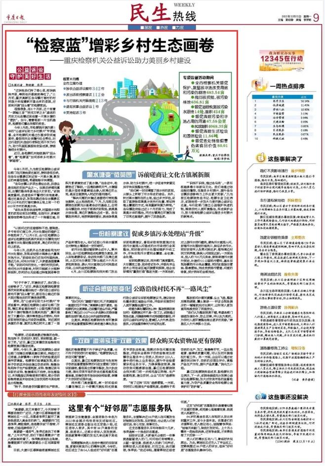 2022年12月12日,《重庆日报》第9版半版刊登《“检察蓝”增彩乡村生态画卷——卡提诺论坛 公益诉讼助力美丽乡村建设》一文,文中对今年3月以来市检察院开展的“公益诉讼助力乡村振兴”专项监督活动进行了系统回顾,内容如下: