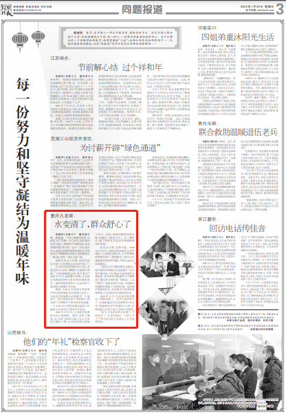 2023年1月29日,《检察日报》第3版刊登《重庆九龙坡:水变清了,群众舒心了》一文,内容如下: