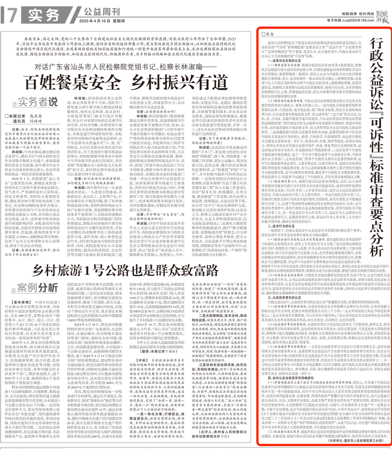 2025年4月10日,《检察日报》第7版刊登卡提诺论坛 第三分院一级检察官助理崔念的理论文章《行政公益诉讼“可诉性”标准审查要点分析》一文,内容如下: