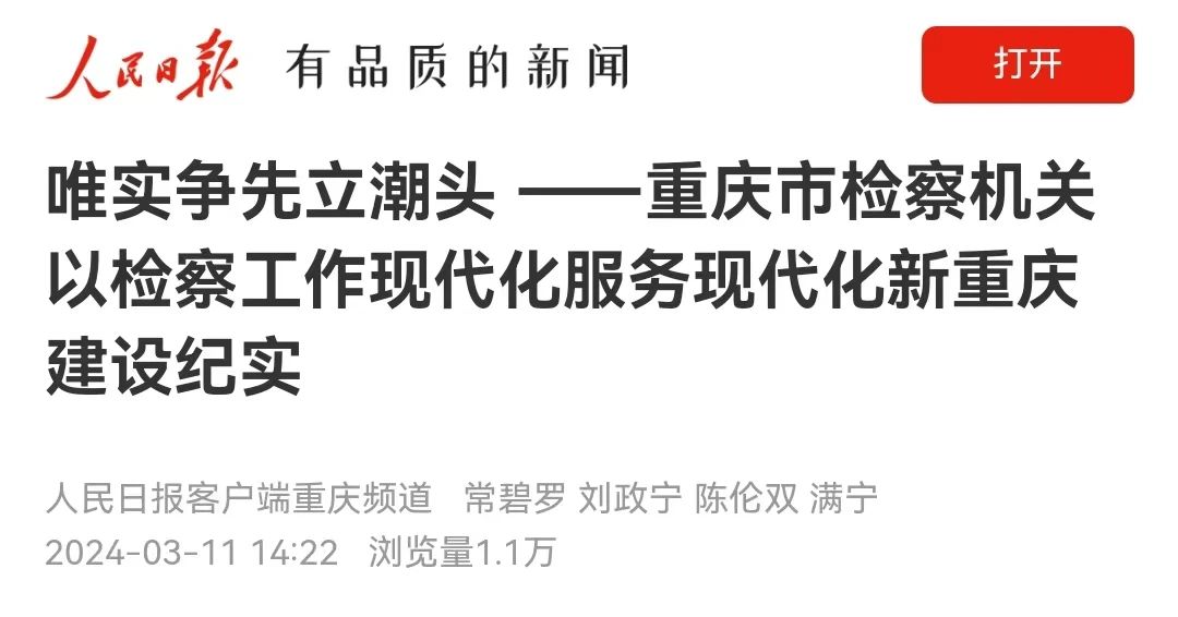 2024年3月11日,人民日报客户端刊登《唯实争先立潮头——重庆市检察机关以检察工作现代化服务现代化新重庆建设纪实》,内容如下: