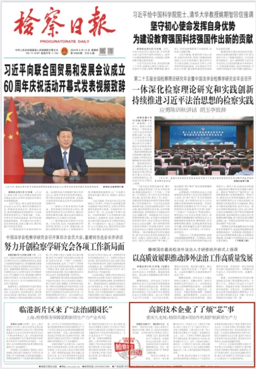 2024年6月13日,《检察日报》头版刊登《高新技术企业了了烦“芯”事 重庆九龙坡:检园共建8项协作机制护航新质生产力 》一文,内容如下: