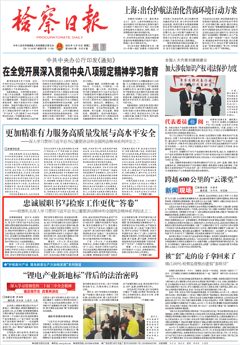 2025年3月18日,《检察日报》头版刊登《忠诚履职书写检察工作更优“答卷”——检察机关深入学习贯彻习近平总书记重要讲话精神和全国两会精神系列综述之二》一文,内容如下: