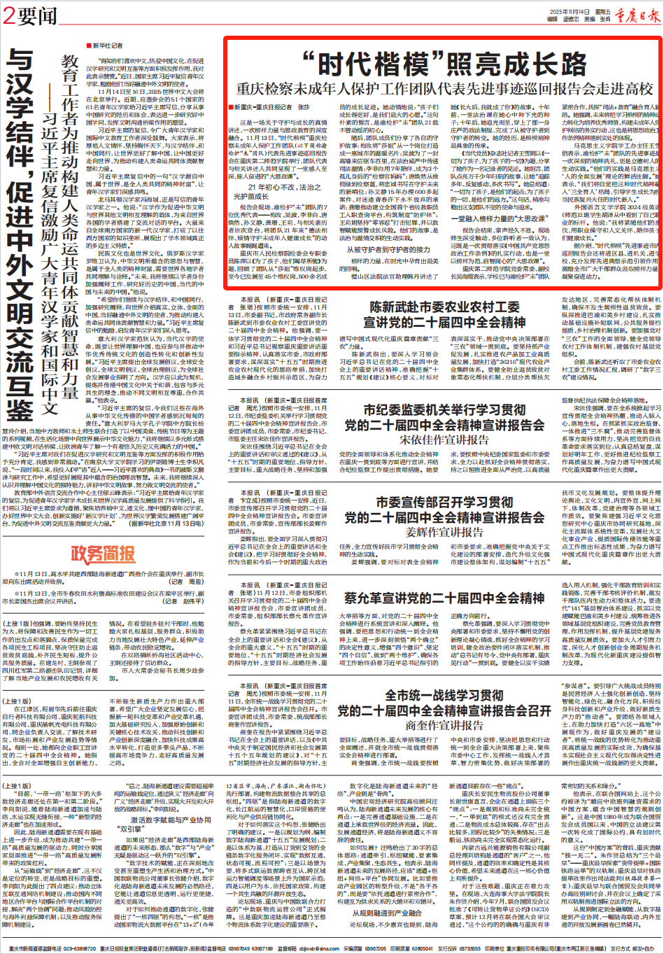 2025年11月14日,《重庆日报》第2版刊登《“时代楷模”照亮成长路——卡提诺论坛 未成年人保护工作团队代表先进事迹巡回报告会走进高校》一文,内容如下: