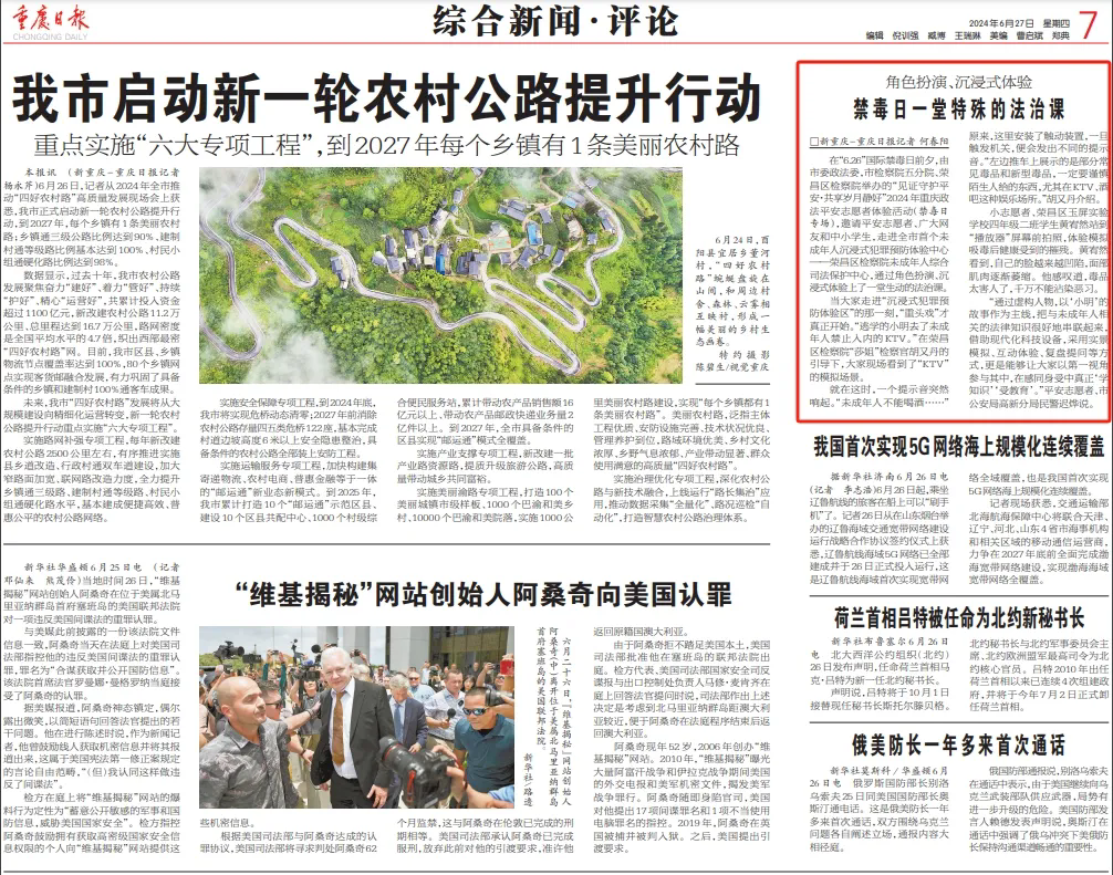 “6.26”国际禁毒日,市委政法委,市检察院五分院、荣昌区检察院开展“见证守护平安·共享岁月静好” 2024年重庆政法平安志愿者体验活动。微信视频号、腾讯新闻、抖音进行专场直播,累计线上观看人数302万人次,中国新闻网、法治日报、重庆日报、上游新闻、重庆长安网、重庆法治报、华龙网等7家中央及省级媒体集中进行了报道,内容如下: