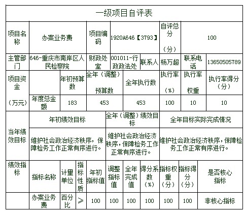 根据预算绩效管理要求,本部门对5个项目开展了绩效自评,其中,以填报目标自评表形式开展自评1项,涉及资金453万元;从评价情况来看,圆满完成2020年年初预算安排,有效办理了黑恶犯罪、民事监督、公益诉讼等案件,维护了本辖区的社会经济秩序。