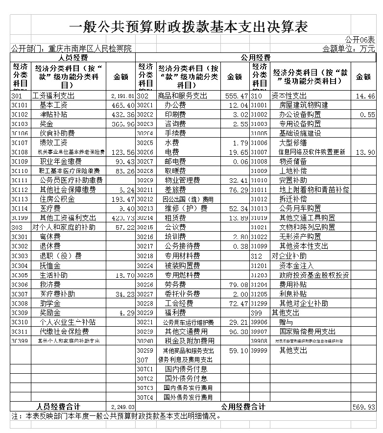 2020 年度一般公共财政拨款基本支出2,818.96万元。其中:人员经费2,249.03万元,较上年决算数减少335.32万 元,下降12.98%,主要原因是职侦转隶人员工资划转等。人员经费用途主要包括基本工资、津贴补贴、奖金、社会保障缴费等。公用经费569.93万元,较上年决算数减少127.73万元,下降18.31%,主要原因是加强节能减排工作、细化日常管理等。公用经费用途主要包括办公费、印刷费、咨询费、手续费等。