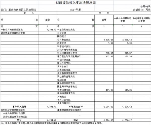本院2017年度收入总计4,204.42万元,支出总计4,204.42万元。与2016年决算数相比,收支减少4.71万元、下降百分之0.11,主要原因是日常公用经费支出减少。