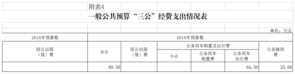 2018年“三公”经费预算89.5万元,比2017年减少2.5万元。其中:因公出国(境)费用0万元,比2017年持平;公务接待费25万元,比2017年减少5万元, 主要是严格执行中央及市级规定,厉行节约,从严从紧开支接待费;公务用车运行维护费64.5万元,比2017年增加2.5万元,主要是调整公务用车运行维护费标准;公务用车购置费0万元,与2017年持平。
